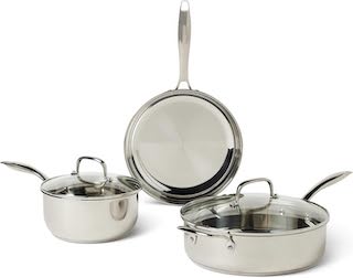 If you want a more complete setup, the Amazon Basics Stainless Steel Cookware 11-Piece Set, Oven Safe, Induction-Ready, Even Heating, Non Toxic, Stay-Cool Handles, Pots and Pans, All Stovetops, Glass Lids, Silver hits a really nice middle ground.