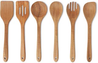 The Amazon Basics Wooden Cooking Utensils, 6-Piece Set, Acacia Wood, Pre Oiled, Cookware-Safe is a simple, classic set that covers the basics for stirring sauces, sautéing vegetables, and serving meals.
