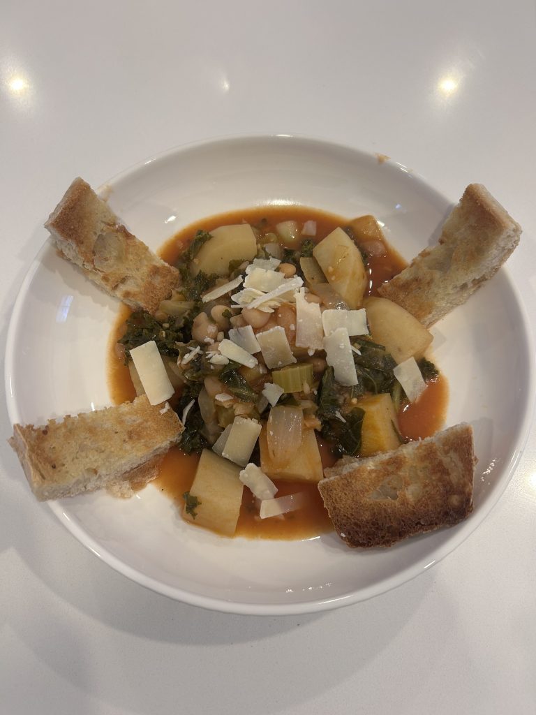 And when the first real snowstorm hit Easton and the world outside looked genuinely Vermont-level quiet, I made Tuscan Ribollita — the thick, bread-thickened Florentine bean and vegetable soup that seems invented specifically for watching snow fall through a kitchen window. Cannellini beans, cavolo nero, stale bread, and patience. There is no better snow day food in the Italian canon.